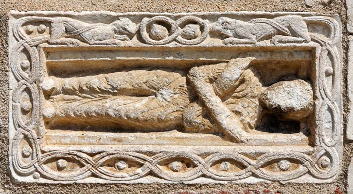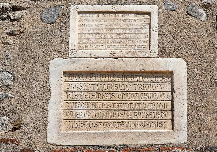 A gauche en regardant la porte, se trouvent en haut les pierres épigraphiées de Frère Berenguer, camérier , décédé le 6 juin 1307 et de sa soeur dame Mathia. En-dessous, la pierre de Dulce de Mont-Roig, décédé le 5 décembre 1271. |