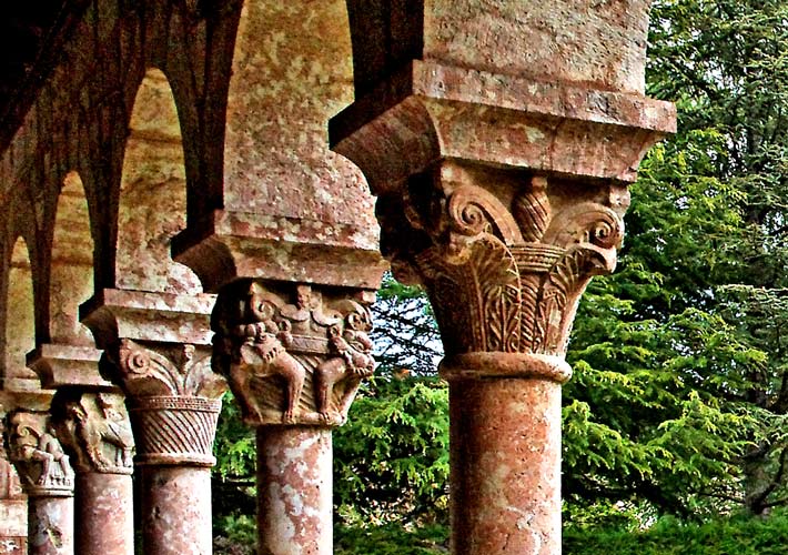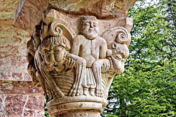 | Situés au bout de la colonnade ouest, ces chapiteaux sont d'un type différent, appelé "second style" par M. Durliat. Leur fond est souvent marqué de stries obliques. On retrouve plus ou moins les mêmes scènes : au premier plan, les feuilles d'acanthe ; ensuite lions dévorants, etc. Le dernier chapiteau est montré en gros plan ci-dessous. |