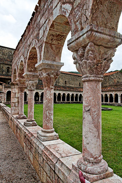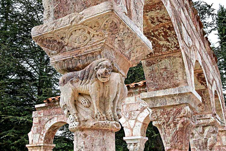 Sur ces quatre autres colonnes, les scènes reprennent l'iconographie du reste du cloître : au premier plan, un massif de fleurs, puis des feuilles d'acanthes et ensuite une procession de lions. Sur le premier chapiteau, le tailloir est sculpté. |