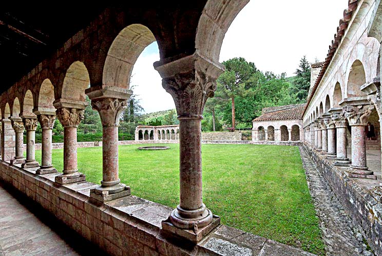 De cet angle, l'ensemble du cloître est pratiquement visible. A droite, on retrouve la partie méridionale et dans le fond, à gauche, on aperçoit la partie fragmentaire du nord-est dont une partie des chapiteaux proviendrait de la tribune qui a été démantelée. Au premier plan les colonnes de la partie ouest sont encore considérées comme étant du premier style. |