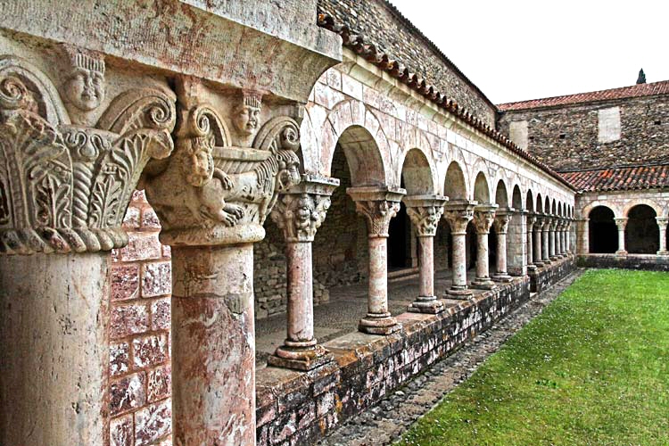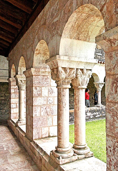 La partie sud-est visible ici et la partie méridionale visible sur la photo de dessous appartiennent à un premier style (cf. M. Durliat). Les chapiteaux font 44 cm de coté, ils sont surmontés de tailloirs carrés sans sculpture. Un dé porte une tête humaine ou animale. L'iconographie est essentiellement animale ou végétale, sans chapiteau historié. Le monde oriental a fortement marqué de son influence les représentations au Moyen Âge. C'est également dans l'Antiquité et dans la Bible que les sculpteurs ont puisé leurs inspirations. Les fabulistes notamment ont toujours inspiré les auteurs médiévaux qui font aussi référence à des ouvrages comme le Physiologus, d'un auteur alexandrin du IIème siècle de notre ère, qui décrit une quarantaine d'animaux réels ou fabuleux dans le but d'en tirer un sens symbolique et spirituel. Faut-il y voir aussi une influence de la 1ère croisade (prise de Jérusalem en 1099)? Cependant la question de l'origine de ce premier atelier et de la formation de ses sculpteurs n'ont pas été résolues ( cf. G. Mallet). |