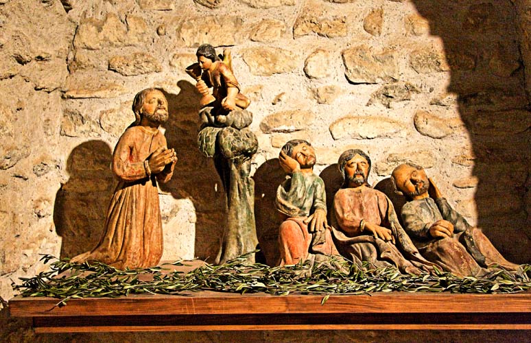 Ce groupe en bois représente l'Agonie de Jésus au Mont des Oliviers. Le Christ est en prière, un ange lui présente un calice pour le réconforter. Pierre, Jacques et Jean sont endormis. Ce thème est assez rare dans la région. Le caractère baroque de l'ange conduit à le dater du XVIIème siècle. |