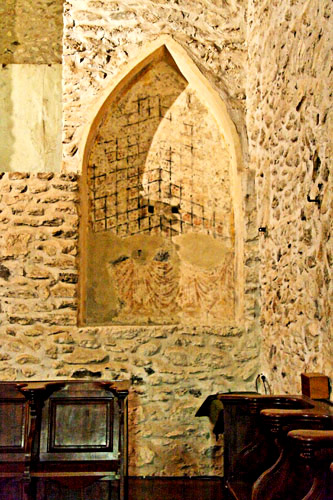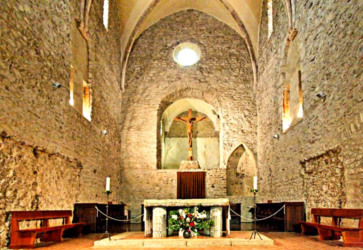 Le choeur s'ouvre largement sur la nef. Cette abside principale a été rehaussée à l'époque gothique pour recevoir une voûte sur croisée d'ogives. La table d'autel est celle qui a été consacrée à l'origine. Des restes de peintures romanes sont visibles dans les échancrures sur les côtés.. Vous pouvez avoir des précisions avec la barre de navigation ci-dessous |