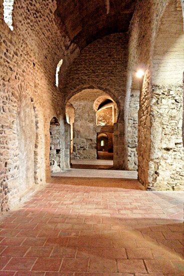 Les collatéraux ont été voûtés par Oliba en demi-berceaux. Le voûtement permit le percement de fenêtres pour éclairer le côté. De plus, Oliba fit construire, dans un premier temps, de chaque coté du choeur deux longs couloirs qui devaient servir de chapelles. (voir la partie sur le déambulatoire).. On aperçoit celui de gauche dans le prolongement du collatéral. Le transept comportait deux absidioles de chaque côté : on entr'aperçoit l'entrée d'une absidiole sur la photo. |